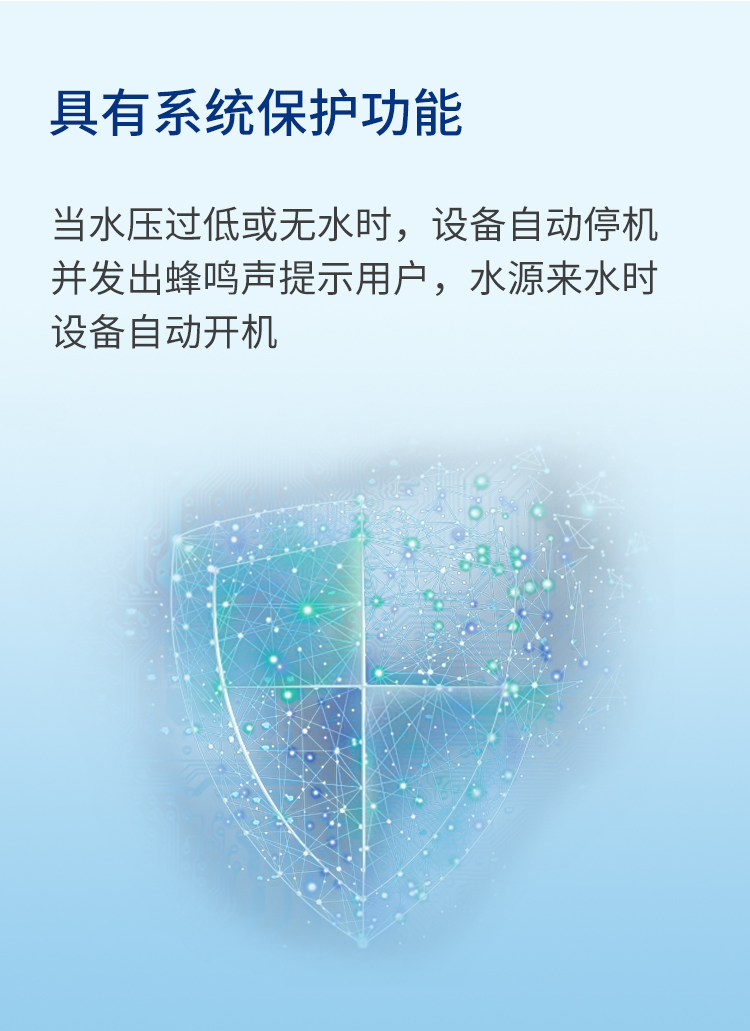 4、具有系统保护功能:当水压过低或无水时,设备自动停机并发出蜂鸣声提示用户,水源来水时设备自动开机;