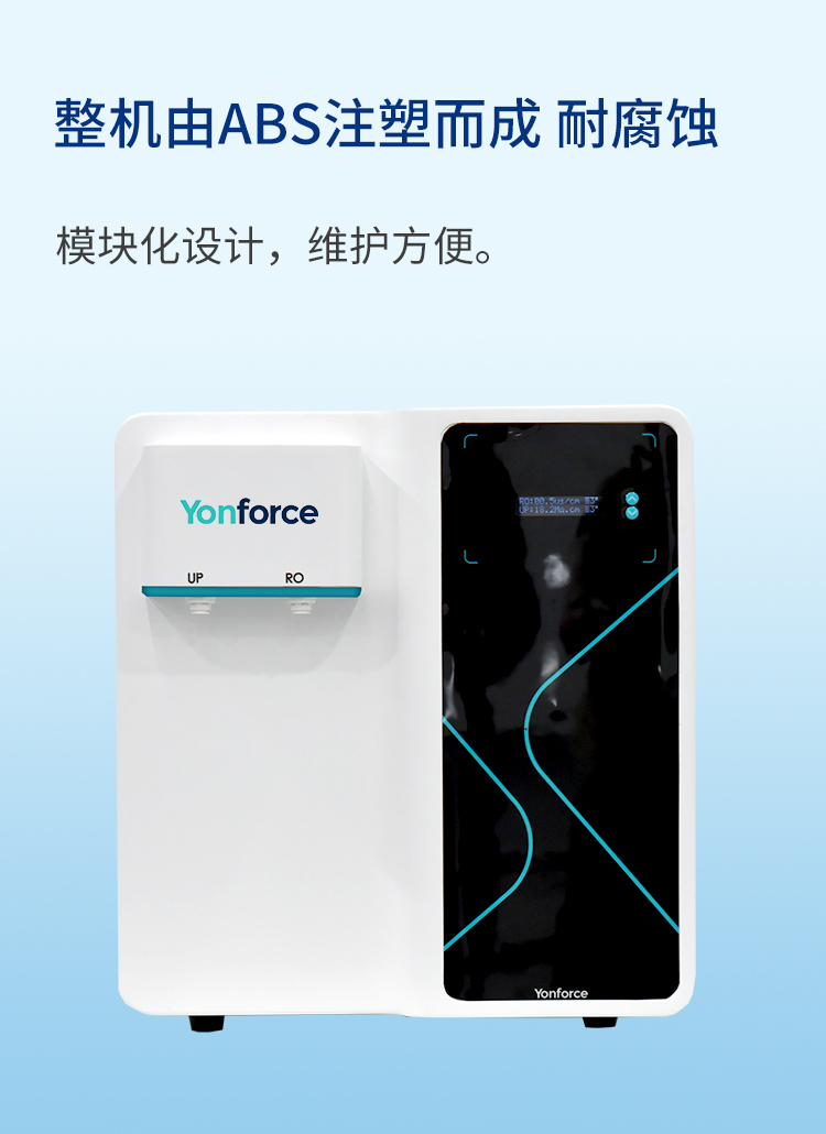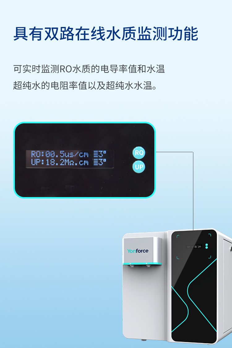 6、YF系列超纯水机具有双路在线水质监测功能,可实时监测RO水质的电导率值和水温、超纯水的电阻率值以及超纯水水温。