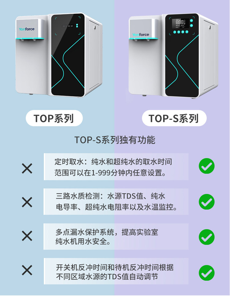 TOP系列超纯水机性能特点:1、具有电源指示,泵浦工作指示,低压指示及系统冲洗指示功能。