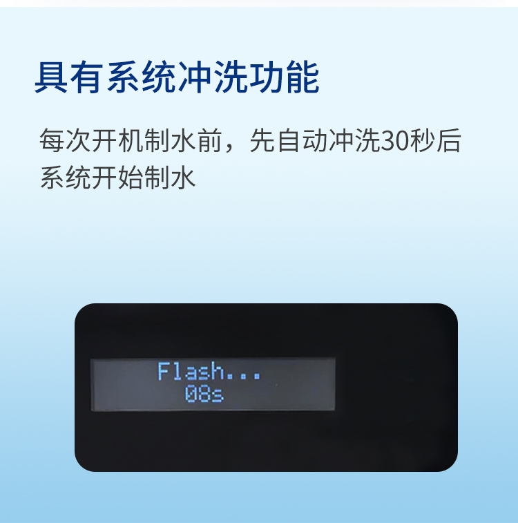 3、具有系统冲洗功能:每次开机制水前,先自动冲洗30秒后,系统开始制水;