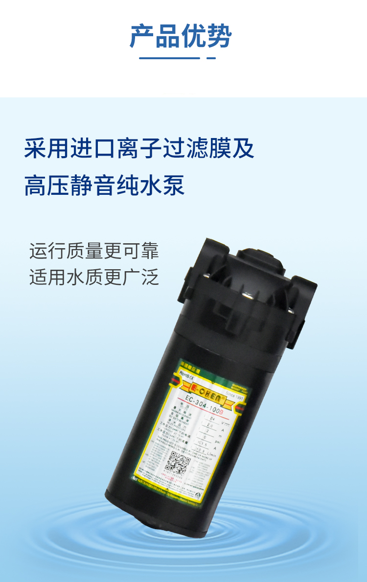 2、采用进口离子过滤膜及高压、静音纯水泵,运行质量更可靠,适用水质更广泛;